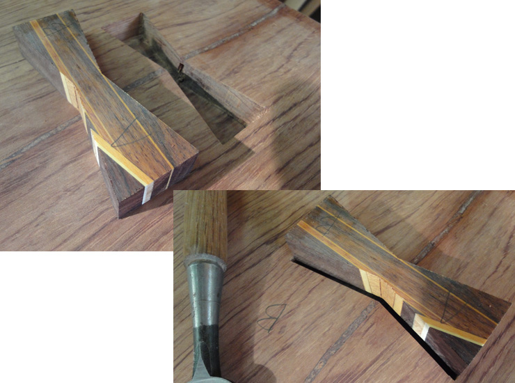 | 普通は色も大事ですが、黒檀などの硬い木を使うようです。が。今回は気に入ったブビンガ(赤ホイット)に、ローズウッドの黒ホイットで千切りを入れてもらいました。どうです?! |