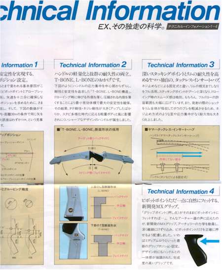 EXの形状的特長は「Tボーン」「Lボーン」と呼んだハンドルの断面形状であり、それに伴う直線を主体としたシャープで斬新な今までにないデザインでした。今見れば当たり前のこのデザインも、当時は異型でした。なぜなら1970年代に登場したテイクダウンですが、それらの金属ハンドルはどれもが前身である木製ワンピースボウの呪縛から逃れることができなかったのです。簡単に言えば、ハンドルが金属になり分解式になったにもかかわらず、弓はすべて旧態然とした昔ながらの木の弓と同じ形をしていました。