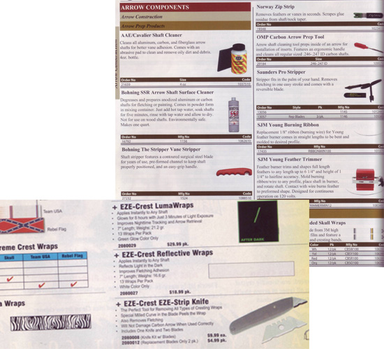 | 例えば先日書いた「接着剤」の話も、日本で普通の生活をしていて「ホットメルト」などと呼ばれる松ヤニ系の接着剤に出あうことは稀です。ところがなぜか、アーチェリーの世界ではこのマイナーな接着剤が当たり前のように思われているのです。海外のアーチェリーカタログを見ればわかりますが、「ホットメルト」は特殊な接着剤であり、どのメーカーも日本では一家に一個あるであろう一般的な「瞬間接着剤」を出しています。ポイントを付けるにしても、ハネを貼るにしてもです。↓これはほんの一部です。 |
