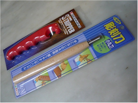 | こちらも日本が世界に誇れる発明品、「彫刻刀」です。先端のアール形状がカーボンシャフトに付いたハネを剥がすには最適だというのです。確かにその通りです。ただし知り合いがいうには、100円ショップの「ダイソー」で売っているこの「小丸刀」が最高とのことなのです。ここから先は皆さんで確認いただければ幸いですが、、、 |