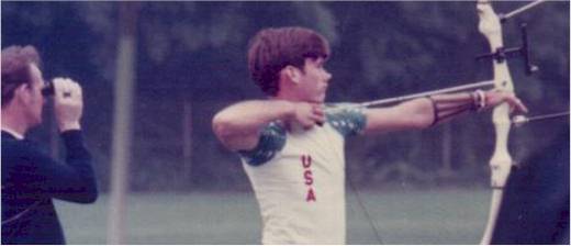 | そしてこれは1973年、プロに転向。翌1974年3月初来日、東京、大阪でその素晴らしフォームを日本のアーチャーに披露してくれた時のものです。31インチを超える矢で90mを狙う姿です。美しさはさておき、今この発射角度で矢を射てば多分120mでも競技ができるでしょう。逆に言えば、当時の70mの発射角度が今の90mです。 |
